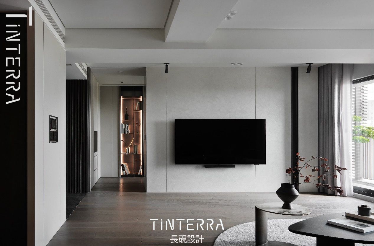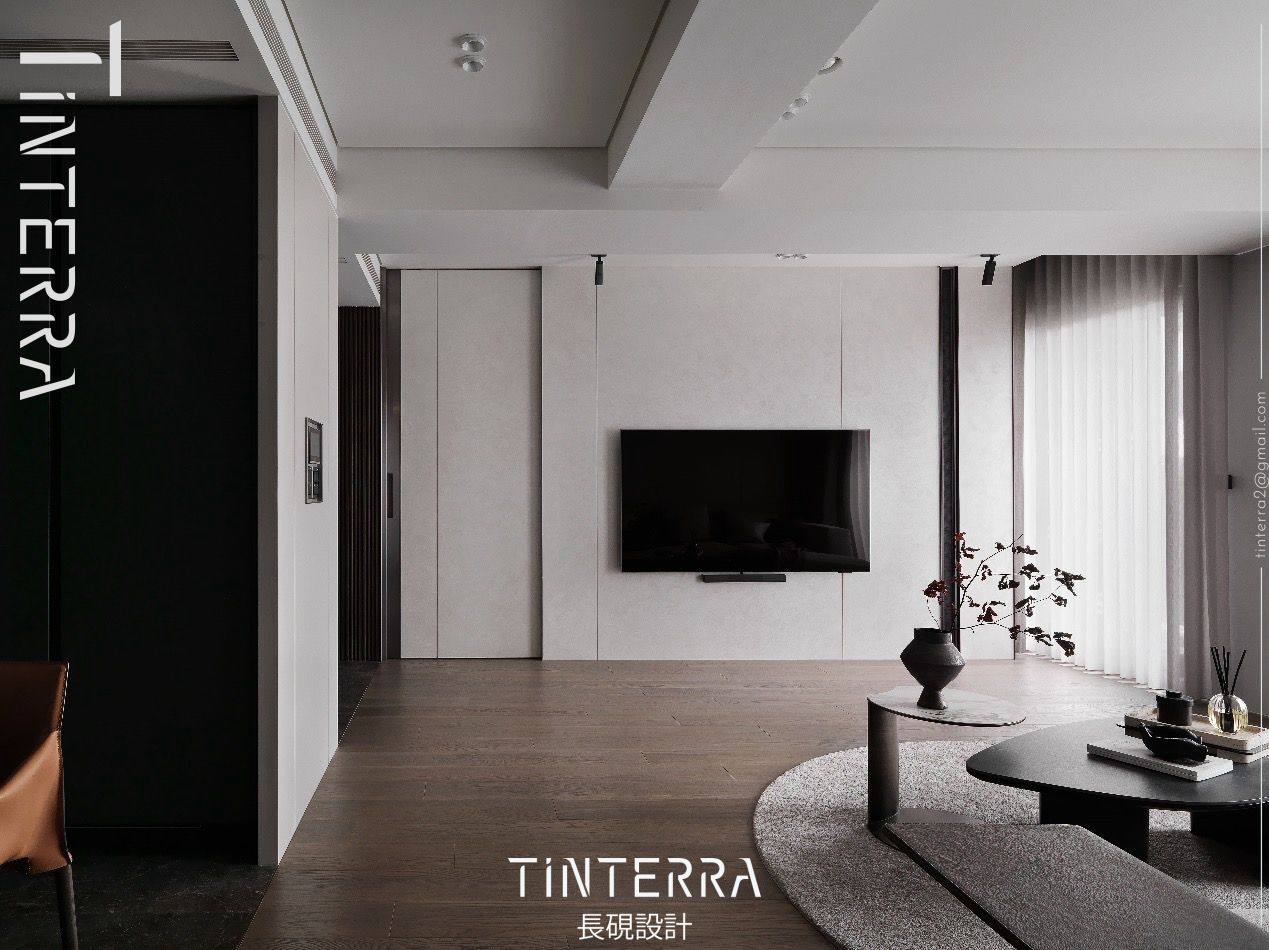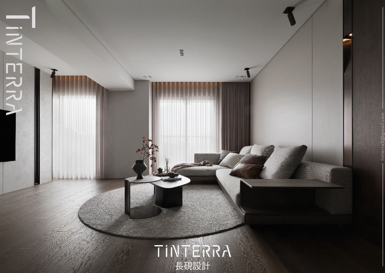 本案以簡約的灰、黑色為主,藉由海島型木地板和深灰地磚區劃兩處,再運用紋理細緻的義大利金屬特殊漆、霧面鐵件、圓形地毯和筆直線條等設計手法,營造「明暗、剛柔、曲直」豐富而和諧的視覺感受,另於細處匯入曲弧造型和金屬收邊,呈遞素雅不失精緻的質感招待所。