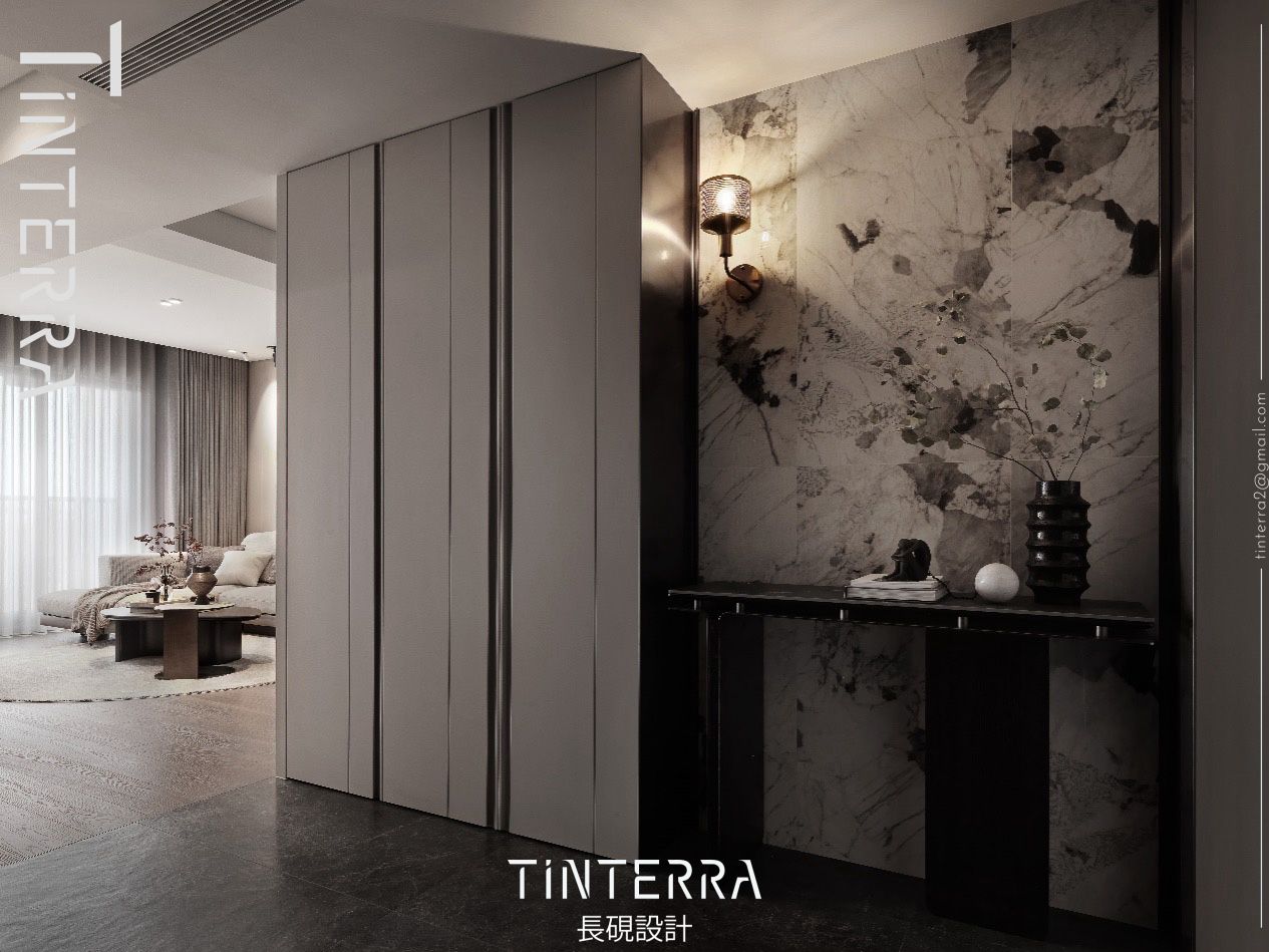 玄關選用紋理如畫的特殊磚與金屬壁燈共組端景,為首次來訪的人們營造初入的驚豔感,也予以居者點燈待歸的溫馨感受;下方平台可放置鑰匙等隨身小物,提升出入便利性。