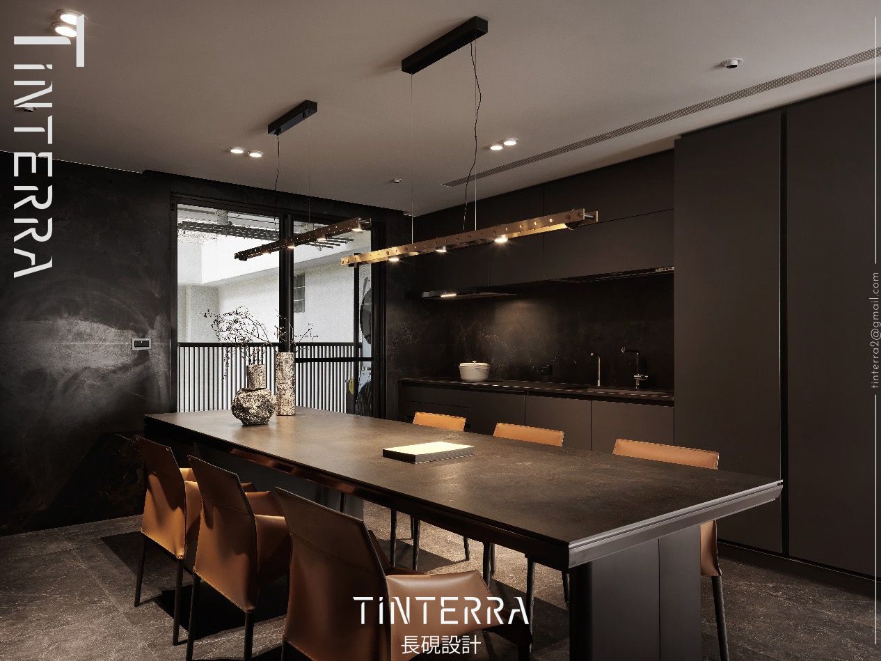 餐廚區以深色為基調,藉由隱藏櫃保持整齊的視覺畫面,中央綴搭橘褐色餐椅、可調整光源的黃銅鋁合金吊燈,為深邃的灰黑場域點染活潑氣息,圍塑沉穩舒適的用餐空間。