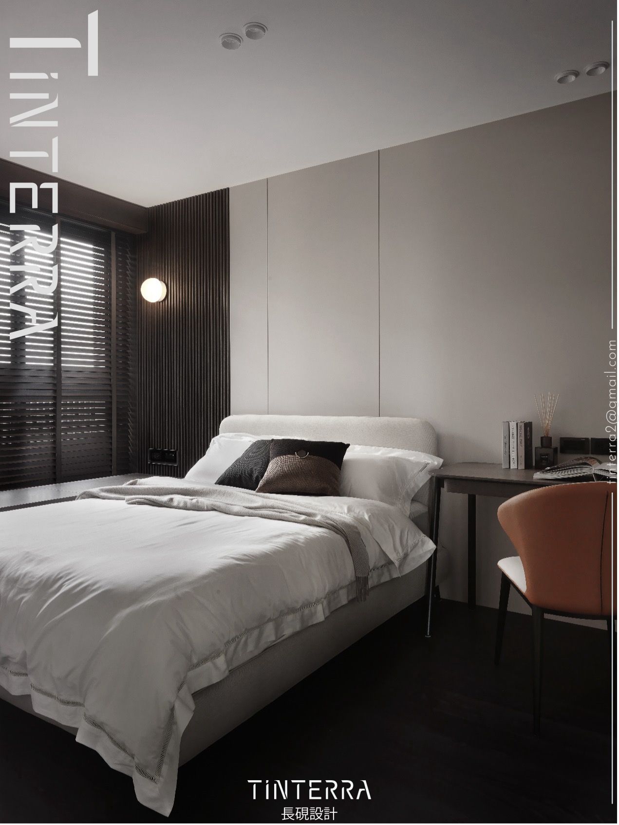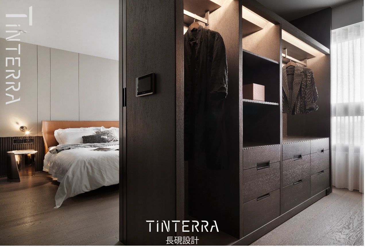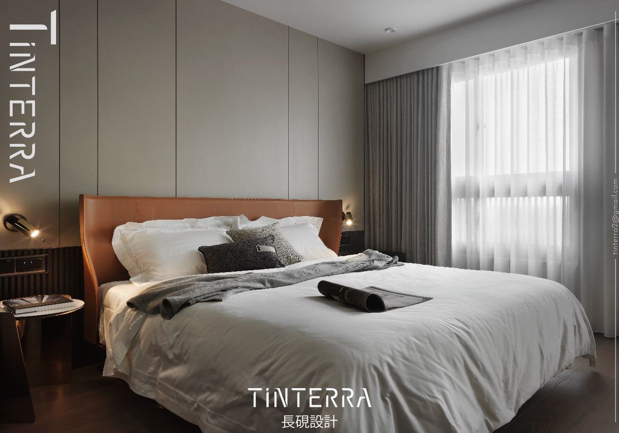 主臥以霧面烤漆床頭牆搭配木格柵半牆、馬鞍皮床頭板,藉中性色彩打造柔和的舒眠環境,兩側的金屬閱讀燈和亮面邊几則提升此處精緻度,予人飯店般的典雅感受。